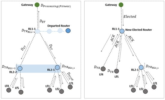 The gateway node (GW) sends the new role of replacement to the node that has a superior fitness value. For example, RL2-2 is the new selected node (EN) that sends a notification of its new role to the affected nodes. The latency for the stage of announcing the selected node ( is expressed in Equation (13):