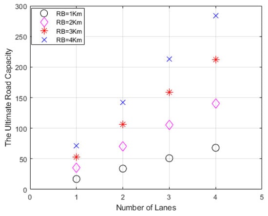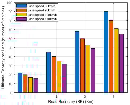 With the increase of number of lanes , the overall road capacity is obtained in which is dependent on the speed of each lane within the road. is one of the road parameters that can have an impact on the possible distribution of number of vehicles on the road. As an example and for analysis purposes, if is considered to be 100 km/h for all the lanes within the road, then will be , and can be obtained depending on the set of number of lanes and road boundary as shown in Figure 7. Therefore, for example, the ultimate road capacity is 284 vehicles when the road boundary () is 4 km and the number of lanes is 4. Figure 7 below clarifies the variation in road capacity in relation to the number of lanes and stretch of the road.