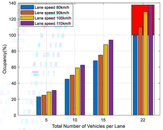 In keeping with the context of the road structure model parameters, the lane occupancy on a highway with a stretch of can be obtained. Having a set of number of vehicles traveling along the highway, a lane with a given speed can be partially or fully occupied with vehicles depending on the lane’s ultimate capacity. This can be shown in Figure 8, wherein four lanes with various speeds range from 80 to 110 km/h and the number of vehicles (5, 10, 15, and 22) moving along each lane are utilized for testing lane occupancy. The lane with a speed of is 23% occupied by vehicles from its maximum limit when the number of vehicles entering the lane is 5. However, the lanes with speed of 90, 100, and 110 reach a saturation point (beyond 100%), as highlighted in red in Figure 8, as the number of vehicles is increased to 22. This is due to the ultimate capacity of these lanes as shown in Figure 6.