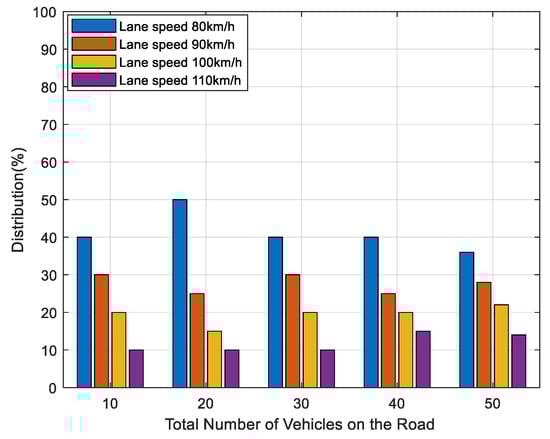 In a multiple lane road system, it is anticipated that the high-speed lane will typically have the fewest vehicles due to its restricted capacity, whereas the lower speed lane will typically have a larger number of vehicles. The distribution percentage of vehicles per lane, denoted by , and the density percentage of each lane, denoted by , are obtained using Equations (2) and (3), respectively, as below: