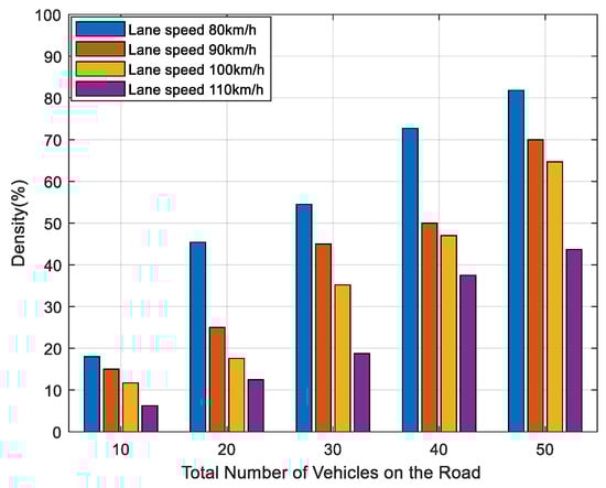 Figure 10 indicates the density percentage for each lane considering the obtained distribution percentage of the lane that depends on allocating the number of vehicles for each lane based on the total number of vehicles traveling along the highway. This can be a validation for the possible vehicular grouping structure, as the lanes should be less dense to offer the flexibility for the network to perform under future dynamic scenarios. For example, vehicles can join the formulated group based on the self-joining approach, which requires the network to be below saturation in terms of density. This can allow the network to have vacancy for the nodes to join its group. As is shown in Figure 10, the density percentage is almost 82% for the lane with a speed of when 18 vehicles are distributed in this lane out of 50 vehicles traveling along the highway.