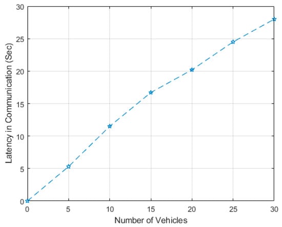 Under this stage, the latency in the communication that is both the transmission and propagation delay is analyzed based on the time that the node takes to disseminate its data to the neighbor nodes and all the neighboring nodes are receiving the data. Figure 11 below shows that with the increase in number of vehicles (5, 10, 15, 20, 25, and 30), latency in communication occurs due to the ad hoc flat communication nature among the nodes where the messages are being sent and could be received by every node within the transmission range. Herein, the timestamps in cooja, with the focus on and , were collected to reflect the latency.