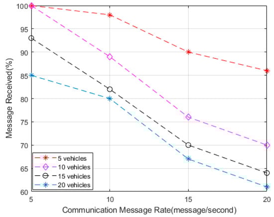 The suggested road stretch and its ultimate capacity based on the suggested highway traffic scenario indicate a possible distribution in which the available vehicles within the road may occupy full or partial capacity. Based on that, the number of hops and the time needed for formulating the vehicular network will vary accordingly. The other factor that can influence the structure of the network is the transmission range of the communication protocol, where the nodes should be within the line of sight (LoS) to formulate the level(s) of connectivity. The gateway router-capable functional node that is operational under any phase of the vehicular grouping approach is set to have a number of connections (capacity). Herein, the best size of a formulated group is tested through the analysis of the gateway-router node capacity in covering the available nodes using a Cooja simulator. As indicated by the road traffic model in which the road’s ultimate capacity is 17 vehicles when the speed lane is 100 km/h, the set of number of vehicles (5, 10, 15, and 20) is considered. In the Cooja scenario, the communication message rate is considered in the range of 5, 10, 15, and 20 messages/second. Based on Figure 12 below, the received messages by a gateway router node connecting five vehicles range from 100% to 86%, whereas the received messages by a gateway router node connecting 10 vehicles, 15 vehicles, and 20 vehicles, respectively, range from 100% to 70%, from 93% to 64%, and from 85% to 61%. The outcome here reflects the possible size of a vehicular group as well as its boundary in a given hop. The ideal size in this scenario would be a group head node connected to 5 or 10 vehicles, forming a single-hop group, with a message rate of 5 messages/second, with 100% of the messages being received. However, this is subject to the number of available vehicles on the road and the type of vehicular application for which a suitable message rate can be chosen.