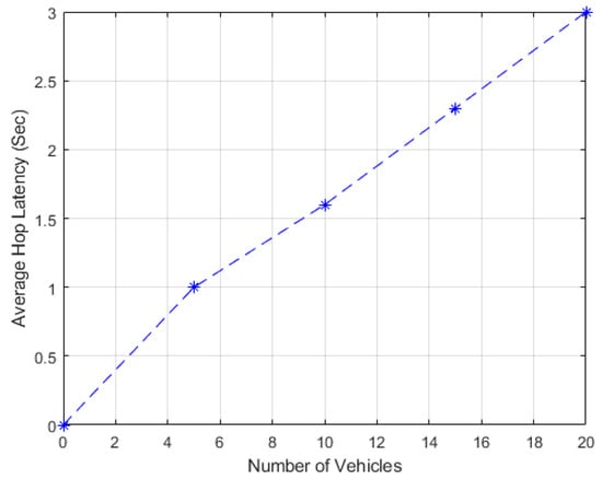 This phase has stages of initialization and data dissemination represented by the ‘Hello’ packet exchanged by the gateway router-capable nodes. The Event Trigger stage is when potential nodes are part of selecting a group head. The event response stage is when the fitness values are exchanged to make a decision for group head selection as well as the rest of the topology. Since each stage has a latency associated with it when it is executed, the self-formation phase is assessed based on the transactional latency. The router node load, in terms of number of connections, within the formulated network is tested based on the average latency in transmitting the data through a router to a gateway as shown in Figure 13. This is related to , , and in the latency model. The set of number of vehicles (5, 10, 15, and 20) is chosen as the number of connections to the router. This also sheds light on the router’s current load and the latency experienced during the parallel hop [].