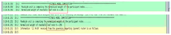 The Cooja scenarios are designed for evaluating the self-healing process with a focus on the event response wherein the network can be re-orchestrated. This stage is dependent on the network factors of network size (in terms of number of hops) and the number of the eligible nodes configured with the replacement functionality to be part of the fitness model. The analysis with the focus on latency is discussed based on the evaluation of the number of capable nodes during the event response, including the processes of the fitness model, when a node is selected, and taking the responsibility of the unconnected nodes (resuming the operation of the network). Latency that occurred within the event response stage is looked at from the fitness computation process and the announcement of the new selected node to resume the operation of the network. This stage is mainly dependent on the number of eligible (capable) nodes participating in the selection process. For the fitness computation, the analytical latency model involves the main components creating the delay within this process. After computing the values of the nodes (an example of the node values is depicted in Figure 14, where node ID 4 is 235 and node ID 6 is 255), the node is selected (node ID 6 in the given example) owing to its superior fitness value. The latency entailed by the announcement of the new replacement node and by establishing the connection with the child nodes of the departed router is part of the event response and re-orchestration of the network.