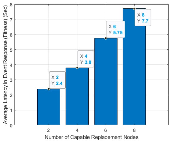 Figure 15 depicts the number of ‘capable replacement’ nodes experiencing latency in Event Response as part of the competition’s fitness computation process. The number of eligible (capable replacement) nodes competing to replace the departed node increases the average latency during the fitness computation process. This is due to the propagation, transmission, and processing (running the fitness model) delay, which is explained in Section 4.