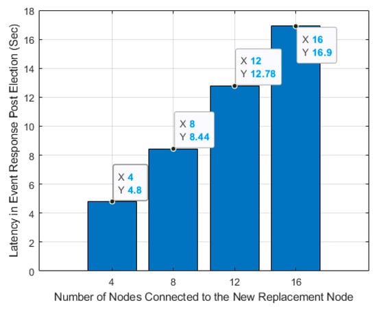 Figure 16 depicts the event response latency following the selection of the eligible node. This includes the latency associated with the gateway announcing the new role to the new replacement node and the new node establishing the connection to the departed node’s child nodes. The increase in number of nodes that the new node needs to establish the connection will impact the latency of the process. Herein, latency increases when the new node establishes a connection with 15 nodes.