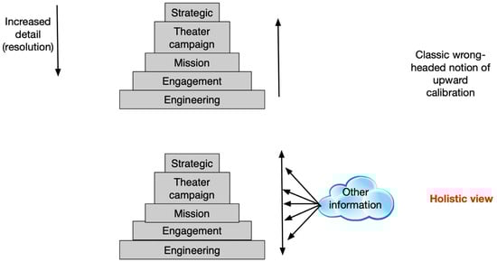 The upward calibration approach might make sense if the detailed models and data (see top of Figure 1) were accurate and certain. Unfortunately, in application areas (as distinct from the idealized universes of physics theory), models at different levels of detail are flawed and their input data are uncertain []. A better approach for the M&S community is to seek mutual consistency across all levels using all the available empirical data []. That is, the bottom depiction in Figure 1 is more appropriate for the military example used: information flows upward, downward, and sideways, connecting information at all levels.