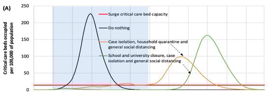 As another example of how simple summary graphics can have a big impact, we might recall the early COVID-19 modeling by Imperial College London []. It generated graphics predicting the collapse of the healthcare system if the pandemic’s infection rate was not greatly reduced (e.g., Figure 2). These projections led to measures such as directives to maintain space between people, avoid large assemblies, and enact temporary lockdowns. Although the original analysis was criticized and was subsequently found to have made some incorrect estimates [], it was extremely influential.