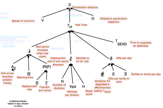 Once again, simpler models sharpened issues, allowed exploratory analysis across scenario space, and explained the results [,]. A simple analytical model organized a good deal of subsequent simulation (see appendix of []). The simple model was summarized with a single graphic showing how the key variables affected the halt time or halt distance (Figure 3). In retrospect, the Greek letters and matrix notation were unfortunate. Later models were expressed in admirably clear prose []. Interestingly, while some conclusions could be tested with more detailed joint campaign models, the more consequential issues could not; they required even more detail (see next case).