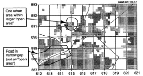 Working with the previous authors, James Bigelow and I sought to untangle the mystery in a study treating the output from an entity-level simulation as empirical data. With fresh thinking about the physics, it became clear that even a “simple” model would need high resolution in a few respects, as suggested by Figure 4 []. This microscopic view of one aspect of the simulation was reflected in an otherwise simple simulation with such aggregate features as average spacing between armored vehicles and average vehicle speeds. For ATACMs to succeed, its impact would have to occur before the vehicles of the target packet entered a wooded or otherwise cluttered terrain, even if the ostensible footprint of the ATACMs was huge. However, what did being “in the clearing” mean? Figure 5 shows the entity-level view. While an aggregate-level map might encode an area as a largely “open” area, much of such an “open” area is actually cluttered with objects (trees, houses and other buildings, and roads). This meant that to use the aggregate-level model, it would be necessary to use data on the size of open areas based on detailed work rather than aggregate maps. Thus, the exercise demonstrated the need for work at different levels of detail even though it also explained the previous mystery and provided a way to estimate the effectiveness of long-range precision fires for a wide range of conditions. Covering such a range with an entity-level simulation was out of the question.