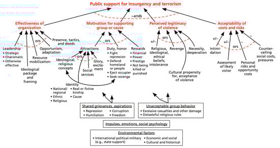 In 2007, the U.S. Department of Defense largely stopped the further M&S of terrorism and insurgency because the results to date had been disappointing. It stepped back to understand the underlying science, calling for a review led by social scientist Kim Cragin and me, which drew heavily on the qualitative social science literature and provided insight about cause–effect relationships rather than mere correlations. The result was a large, edited book [], the themes from which were summarized in factor tree models. Figure 8 is an example of a factor tree from a follow-on study []. It is a multi-resolution qualitative model indicating the variables (factors) affecting public support for insurgency and terrorism.