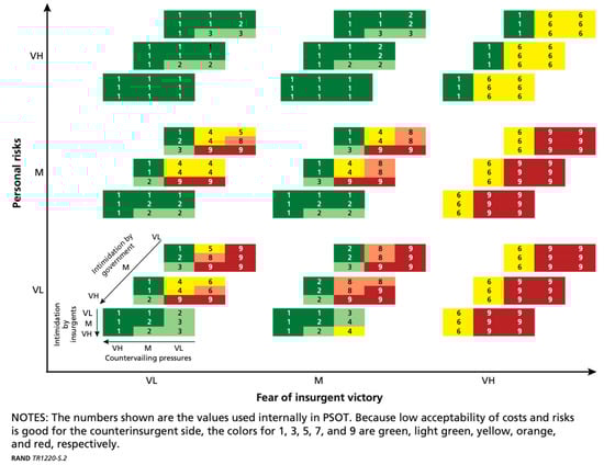 Figure 8 is a factor tree for a snapshot in time. However, what about dynamics? Ideally, the project would have had a family of models that included system dynamic simulations, agent-based simulations, empirical time series, and so on. We had none of that, but we discussed dynamical considerations based on the social science research in the text. This was important because the tree-like structure at a snapshot in time does not convey a sense of how the factors change over time and how they affect each other and become intertwined as they do so. At least one effort to undertake related modeling was undertaken by the U.S. Joint Staff in an attempt to understand in modeling language the implications of the then new Army–Marines counterinsurgency manual. The result was an interesting and insightful system dynamics model said to have been useful to people in the field attempting to understand the Iraqi and Afghan wars []. It was not, however, useful for prediction. Further, it was deemed to be too complicated to be helpful in most discussions.