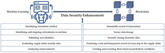 In the field of security, combining blockchain with ML may result in new and reliable solutions (Figure 1). For example, blockchain may be used to establish an immutable record of transactions that cannot be changed, and ML algorithms can be taught to identify patterns of fraudulent conduct in financial transactions. Blockchain may also be used to securely store data about network activities, and ML algorithms can be used to identify and stop cyberattacks in real time. ML may be used to validate users’ identities based on biometric data, which can be utilized for identity verification. It is more difficult for hackers to obtain and use this data if it is securely stored in a decentralized way using blockchain. ML algorithms may be used to evaluate this data and find patterns of suspicious behavior or possible security breaches in supply chain security. Blockchain can be used to produce a safe and transparent record of every step in a supply chain. Lastly, ML can be used to analyze the behavior of these contracts and spot potential security flaws, helping to avoid the loss of money or other assets. Smart contracts are automatically executed based on predefined conditions and can be created using blockchain.