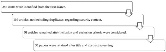 In recent years, security studies literature has expanded as an increasing number of academics have taken an interest in the topic. By using the AND OR search operators, a great quantity of relevant material on themes such as “Machine Learning”, “Security”, and “Blockchain” can be located. On 9 March 2023, 33 articles remained from 369 ones (Figure 2).