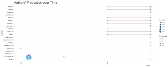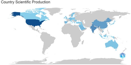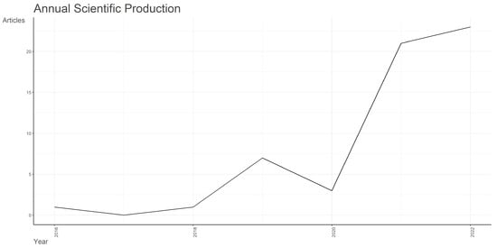For conducting the bibliometric study, it was exploited the well-known R tool, respectively the Biblioshiny 4.1 software, developed by Aria and Cuccurullo []. Biblioshiny provides insights about the analyzed area, along with highlighting crucial linkages between different aspects, considering its outstanding ability to evaluate data, design graphs, and create illustrations, interactive tables, and images []. Considering the scientific literature, it has been chosen for bibliometric analyses from various research areas, such as, but not being limited to: software testing [], analyzing oil prices and financial assets [], education [], Industry 5.0 [], the use of artificial intelligence in agent-based modeling [], the use of agent-based modeling in transportation [], grey systems theory [], neutrosophic theory [], and cybernetics [].