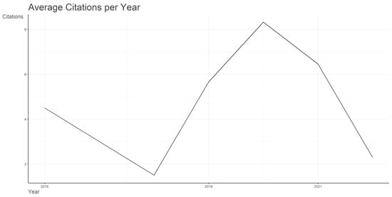 Figure 2 captures the annual average article citations per year evolution, with values that oscillate within 1.5 and 8.3, suggesting that the papers written in the area of mapping the landscape of misinformation detection had a remarkable visibility in the selected timestamp of 2016–2022. The trend is characterized by fluctuations—the greatest value was registered in 2020, while the smallest one, in 2017. Analyzing the peak in Figure 2, we can anticipate that a great number of the papers included in the dataset are related to the misinformation detection in the period of the COVID-19 pandemic. The downward trend depicted for 2021 and 2022 in Figure 2, correlated with the high number of papers published in the 2021–2022 period as presented in Figure 1, might be due to the limited period of time between the year in which the papers have been published (2021, respectively 2022) and the moment in which the dataset has been extracted (2023) and might not be related to a decrease in the interest in the topic of misinformation detection.