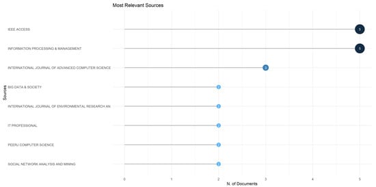 Figure 3 brings to the foreground the top 8 most relevant journals based on the number of published documents in the area of misinformation detection. The top has been obtained by imposing that each journal should have a minimum of 2 publications in the area of misinformation detection. The leadership position is held by the 2 prominent sources, IEEE Access, and Information Processing & Management, both with 5 papers. The International Journal of Advanced Computer Science and Applications is ranked in the third place, with a close value of 3 documents.