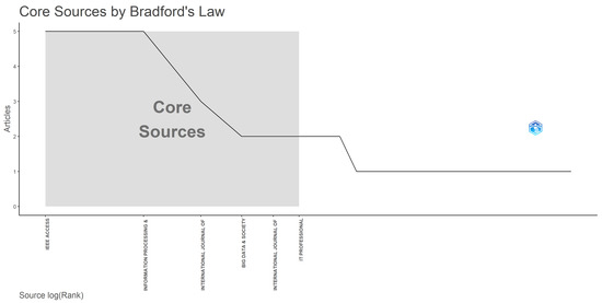 For example, Bradford’s law on source clustering delineates the most-cited journals within the selected dataset. According to Bradford’s law, the journals are divided into three categories by taking into account the number of articles published by each of them [,]. Basically, it is expected that when considering the proportion of the papers in every cluster to represent 1/3 of all the papers, the number of sources in each cluster is 1:n:n2 [,].