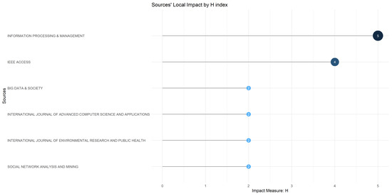 Furthermore, it has been observed that all the papers listed as top journals based on H-index (in Figure 5) have also been listed as top journals based on the number of published documents (Figure 3), highlighting the important contribution of these journals to the body of literature associated with misinformation detection.