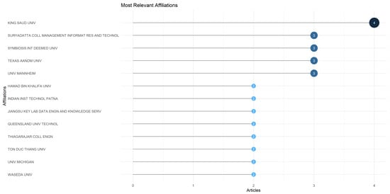 The top 13 most relevant affiliations based on the number of published articles are shown in Figure 9.