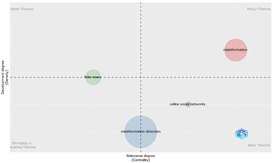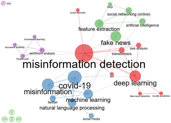 The information regarding the documents’ contents is presented in Table 4. A total of 199 keywords have been documented, with an average of 3.55 keywords associated with each document. The obtained value is in line with other research from the field which has featured the use of a bibliometric analysis, being positioned at the superior limit of the expected data []. As the extracted papers on misinformation detection have been published mostly in the recent year, it has been observed that the issues related to keywords retrieval by WoS from the journals’ websites or the situations in which the journals did not require for the papers to have keywords specified within their content—as discussed by Liu []—have been overcome.