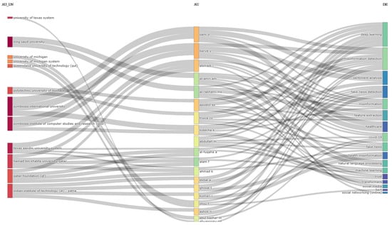 Considering the journals that have been included in the top 8 most relevant sources, it should be noted that most of the sources are in the area of computer sciences, while some of them are in the area of social sciences and public health. Given that most of the papers included in the dataset belong to the COVID-19 period, it was expected that the profile of the journals in which the papers dealing with misinformation detection have been published be of either computer science or social networks—public health.