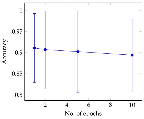 We can see how the estimated accuracy changes with the number of epochs. In Figure 2, we have plotted the accuracy with three-sigma error bars vs. the number of epochs. Under the Gaussian assumption for the distribution of the sampling accuracy, the three-sigma interval ensures that accuracy values fall into this interval with 99.7% probability []. Hence, the three-sigma interval can be considered a safe bracket for the accuracy values we can obtain for out-of-sample data. We can see that the average accuracy degrades by a tiny amount (1.8%), probably highlighting a slight overfitting. In order to provide a quantitative indication of the degree of overfitting, we compare the accuracy we have obtained on the training and testing datasets, respectively. The presence of overfitting is due to the ML model parameters being too fit for the training dataset at the expense of the capability of generalizing and obtaining good accuracy on the testing dataset. For that reason, we considered the following overfitting metric, where the accuracy gap is normalized to the average accuracy over the testing and training datasets:
