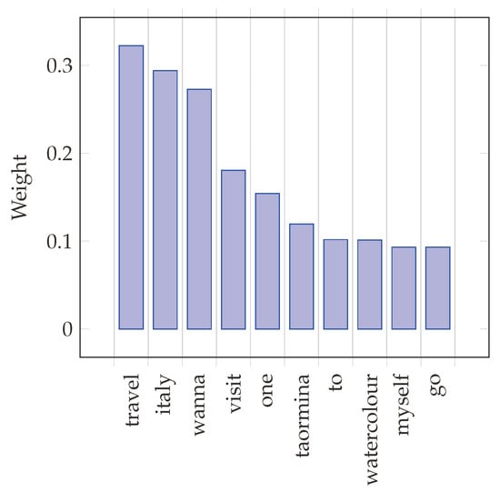 The relationship between the information quality of social media and the intention to travel was investigated in []. The method of analysis was based on the Elaboration likelihood model framework and employed multiple linear regression to test the research hypotheses. The viewpoint adopted in [] is, however, different from ours: they study how the intention to travel of a social media user is influenced by other social media users through their posts (and the quality of the information they convey), while we considered whether a post by a social media user expresses their intention to travel.