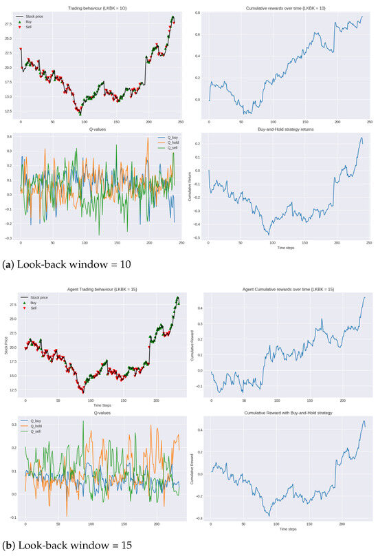 This section showcases the application of the trained agent to our custom environments. The results, obtained with varying look-back windows and an augmented state space, offer insights into the agent’s sensitivity to these design choices. In order to ensure a valid test simulation, the DDQN agent should not benefit from hindsight or look-ahead bias. This is achieved by only giving the agent access to information that would have been available at the time of the trading decisions, ensuring that the agent’s performance on the test set is representative of its true capability.