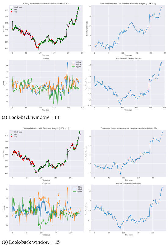 Two environments were examined, namely a conventional trading environment and an augmented trading environment where sentiment analysis data were incorporated into each state representation. The objective of this comparison was to assess the impact of sentiment analysis data on the trading decisions and overall performance of the agent. Alongside the environments, various look-back windows were experimented with to determine the optimal number of past trading days the agent should consider when deciding on an action.