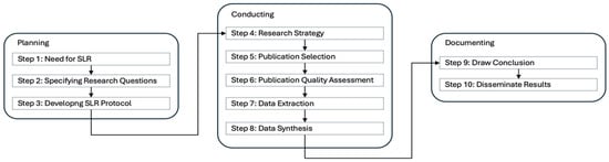 In the planning stage of an SLR, the initial step involves determining the necessity for conducting an SLR []. The need for the SLR in this research is detailed in Section 1. Additionally, the broad objectives and scope of the study are delineated using the population, intervention, comparison, outcome, and context (PICOC) framework as outlined in Table 1.