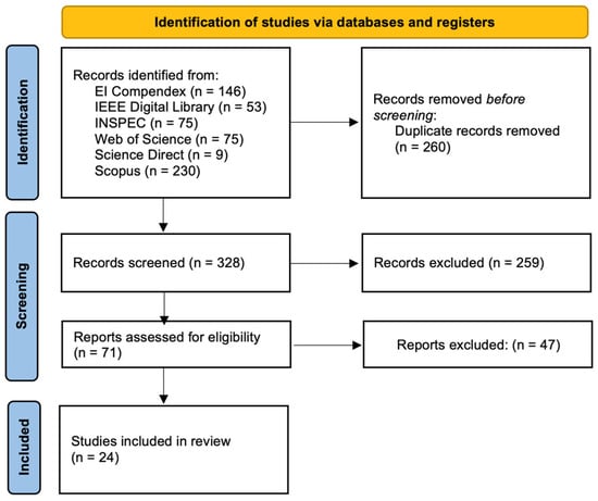 In this SLR, we considered those articles that obtained a score higher than 3 to ensure high-quality and reliable findings. We finally ended up with a total of 26 articles. Figure 2 shows the process carried out during the literature review. Beginning with a total of 588 papers identified, 260 were discarded for being duplicates. From the 328 left, after reading the titles and abstracts, 259 of these were rejected considering inclusion and exclusion criteria. Finally, the last 69 papers, after reading them one by one, were evaluated taking the QA into account. A total of 24 papers received a score higher than 3 out of 6. These papers were analyzed in depth for data extraction and synthesis.