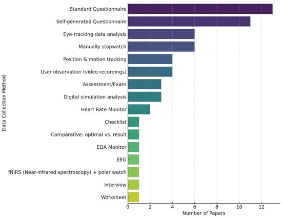 In addition to the devices, the different techniques and methods used to collect data from the experiences have been compiled (Figure 4). The most used method is the questionnaire, with standard questionnaires such as NASA-TLX [], QUIS [] or UEQ [], appearing in at least 13 articles. Also, self-generated questionnaires, i.e., questionnaires that are either adaptations of existing questionnaires or created by the researchers of the study, are used in 11 articles. Following this method, the next most used methods were eye-tracking (six items such as Ref. []), stopwatch (six) to measure time, and both position tracking (four) and video recordings (four) to make user observations.