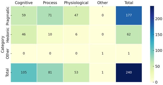 To examine the varying significance of the different types of data collection methods, Figure 5 was created. From the table, it is evident that pragmatic methods dominate across most categories, particularly in the process and cognitive dimensions, with 71 and 59 occurrences, respectively, contributing to a substantial total of 177. Hedonic methods appear less frequently, with notable counts only in the cognitive (47) and process (10) categories, resulting in a total of 62. Physiological methods are predominantly pragmatic (47 occurrences) but are scarcely represented in the hedonic (6) category. Overall, the total occurrences of each method type highlights a preference for pragmatic methods in data collection, as shown by the aggregated totals, emphasizing their prominence in this study.