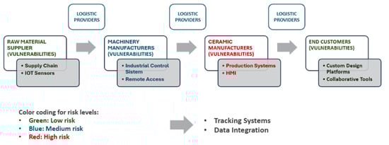While the integration of IoT devices, automation systems, digital twins, and artificial intelligence offers unprecedented opportunities for operational efficiency and competitive advantage, it simultaneously exposes organizations to new categories of cyber threats. Traditional cybersecurity frameworks, largely designed for static technological environments, prove inadequate when confronted with the dynamic, human–AI collaborative systems that characterize modern industrial ecosystems []. The ceramic industry exemplifies these challenges, representing a paradigmatic case of how hard-to-abate sectors must simultaneously pursue digital innovation, environmental responsibility, and cybersecurity resilience [].
