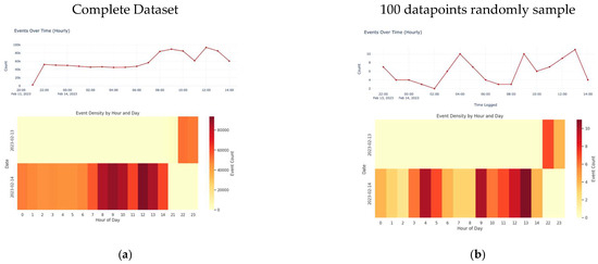 Some important feature exploration plots with comparison between the entire dataset (left) and 100 randomly selected datapoints (right). (a) Data visualization for the whole dataset. (b) Data visualization for 100 datapoints. (c) Data visualization for the whole dataset—Time-Logged. (d) Data visualization for 100 datapoints—Time-Logged. (e) Threat/Content Type for the whole dataset. (f) Threat/Content Type for 100 datapoints. (g) Repeat count type for the whole dataset. (h) Repeat count type for the 100 datapoints. (i) Distribution type for the whole dataset. (j) Distribution type for the 100 datapoints.