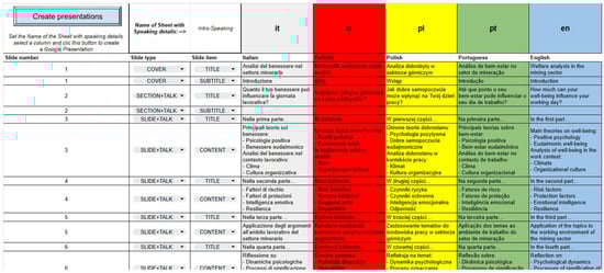 By using Google Sheets and their Google Script programming language, a sort of management system was developed. It supports creating and managing the production of multilanguage courses. It was designed to allow instructional designers to define in their own language what they would like to show in their slides to the learners. By using Google Translator functions directly accessed in the cells of Google Sheets, these details are automatically translated in all the languages they need (Figure 1). This system, using Google Script procedures and a set of slide templates where titles, subtitles, content, and a speaker shape are defined (Figure 2), automatically creates Google Presentations with the detailed slides. It can create one Google presentation for each chosen language.