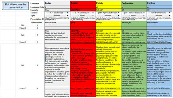 The ERASMUS+ project named DigiRescueMe, Standardization and Digitalization of Rescue Education in Mining (2021-1-TR01-KA220-VET-000028090), has the goal of developing e-learning modules aimed at increasing the knowledge, mental, and awareness levels of miners, rescue members, and mining engineers on topics related to rescue, risk assessment, and wellbeing, as identified through an investigation of their learning needs []. The main goal of the project is to provide easy-to-understand learning content to people from Türkiye, Poland, Portugal, and Italy. Usually, people working in mines do not speak English proficiently and the vocabulary in their own tongue is not so rich in technical terms. For these reasons, a multilanguage approach should be preferred to better engage people and keep content more effective for them. Achieving this by engaging teachers or human speakers of different languages may be expensive and difficult to manage.