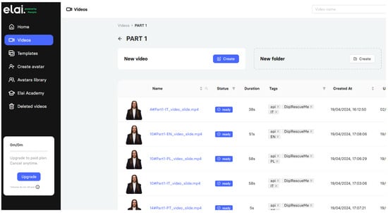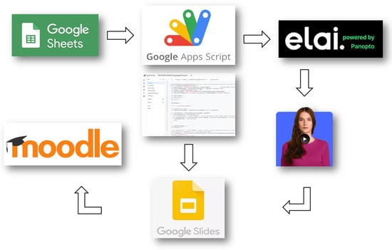 By using the API, an external artificial intelligence engine may be called to create virtual talking avatars. For this project, ELAI was selected since it offers high quality in generating speaking avatars (Figure 4), and many API functions were called directly from Google scripts. It allowed automating the process of creating multilanguage content. The talking avatar videos can be created, downloaded, and integrated into Google slides directly by using Google Script procedures. The schema of the logic implemented is shown in Figure 5. Specifically, the Google script procedures may be called by clicking on the buttons in the sheets. These procedures create new Google slides by customizing the templates and substituting titles and texts in all the selected languages. Figure 6 shows the translations of the same slide in English (a), Italian (b), Turkish (c), and Polish (d). After that, they can call the ELAI engine through its API to generate videos with talking avatars using the text written as speech. Finally, these videos are added into the Google presentations, and the presentations themselves are uploaded as resources onto the Moodle platform.