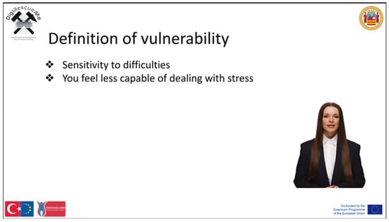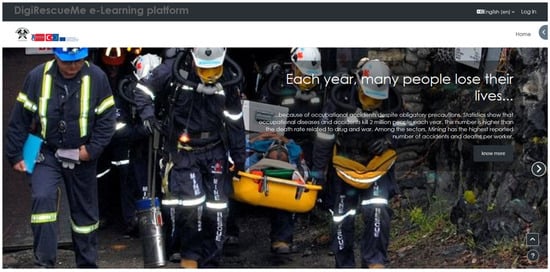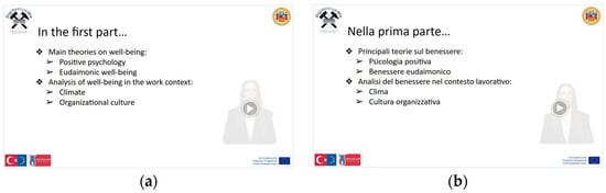 The courses cover topics that, while specific in some cases, are introduced with a gradual approach that makes them particularly accessible and do not require particular prerequisites or prior knowledge to follow. The three courses have the same structure: a mandatory initial assessment with twenty multiple choice questions on the knowledge covered in the course; a sequence of videos with a speaker, supported by slides; a mandatory final assessment with a different set of twenty corresponding multiple choice questions on the covered concepts and a questionnaire to collect their opinions on this e-learning experience. The “Mental wellbeing in Mining” and “Rescue in the mine” courses had a virtual speaker (as shown by Figure 9); the “Risk assessment” course had a human speaker (as shown by Figure 10). Each course had an average duration of about 3 h. No functionality to allow interaction between participants was enabled.