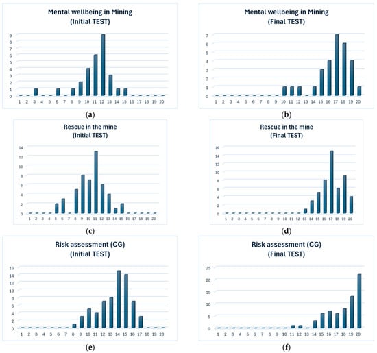 Results on initial and final assessments on the three courses. (a) Initial assessment results on “Mental wellbeing in Mining”; (b) final assessment results on “Mental wellbeing in Mining”; (c) initial assessment results on “Rescue in the mine”; (d) final assessment results on “Rescue in the mine”; (e) initial assessment results on “Risk assessment”; (f) final assessment results on “Risk assessment”.