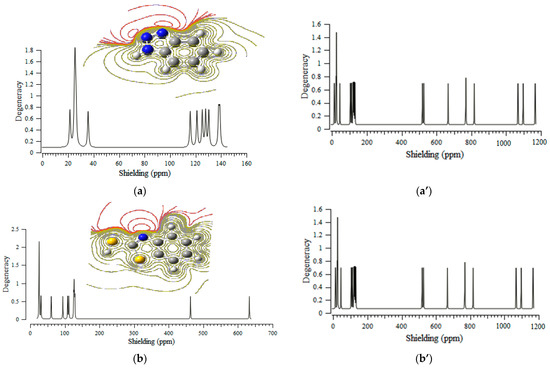 The heterocyclic organic inhibitors of benzotriazole, 2-mercaptobenzothiazole, 8-hydroxyquinoline, and 3-amino-1,2,4-triazole-5-thiol showed an approximately identical behavior (20–200 ppm) for various atoms in the active sites of these compounds through the “NMR” properties and electrostatic potential “ESP” surface (Figure 3a–d,a’–d’). The strongest peak was seen at almost 20 ppm for these components. The weakest peaks appeared at 120–140 ppm for all four heterocyclic carbenes, which consisted of benzotriazole, 2-mercaptobenzothiazole, 8-hydroxyquinoline, and 3-amino-1,2,4-triazole-5-thiol (Figure 3a–d).