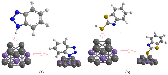 Then, the atomic charge and “NMR” data of the isotropic (σiso) and anisotropic shielding tensor (σaniso) for benzotriazole → Al-Mg-Si, 2-mercaptobenzothiazole → Al-Mg-Si, 8-hydroxyquinoline → Al-Mg-Si, and 3-amino-1,2,4-triazole-5-thiol → Al-Mg-Si were calculated using Gaussian 16 revision C.01 software [35]; the results are reported in Table 2 [52,53,54].