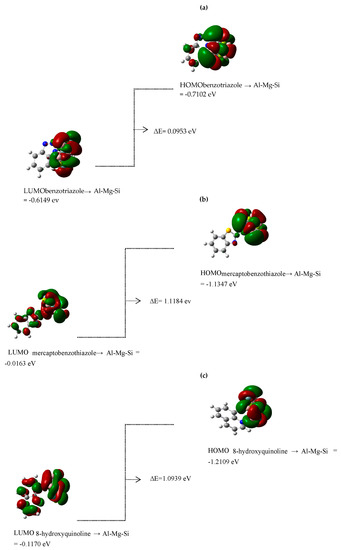 Ionization causes the highest occupied molecular orbital (“HOMO”) energy, and the electron affinity produces the lowest unoccupied molecular orbital (“LUMO”) energy, which were calculated and reported for benzotriazole → Al-Mg-Si, 2-mercaptobenzothiazole → Al-Mg-Si, 8-hydroxyquinoline → Al-Mg-Si, and 3-amino-1,2,4-triazole-5-thiol → Al-Mg-Si (Scheme 3). The “HOMO” (au), “LUMO” (au), and band energy gap “∆E = E LUMO- EHOMO” (ev) present a pictorial explanation of the frontier molecular orbitals and their respective positive and negative zones, which were important factors in identifying the molecular characteristics of effective compounds in these organic inhibitors (Scheme 3).