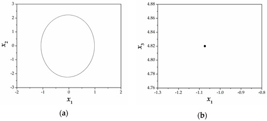 A route to chaos through a quasiperiodic behavior, when decreasing the value of a, is observed in the bifurcation diagram of Figure 3. In more detail, the proposed system (8) displays periodic behavior for a ≥ 4.21, (period-1 steady state and period-2 steady state), which is confirmed from the phase portraits of Figure 5a,c and Poincaré maps of Figure 5b,d, respectively. Especially in the Poincaré maps, which are produced with the same technique as described for the production of the bifurcation diagram, a discrete number of points showing the period of system (8) are depicted. As the parameter a further decreases, the system through a quasiperiodic behavior, which appears in a very narrow band (4.207 ≤ a < 4.210), is driven to a complex behavior for a < 4.207 (Figure 5e). System (8)’s quasiperiodic behavior is confirmed from the closed curves in the Poincaré map of Figure 5f, according to the theory. In addition, the system’s complex behavior for a < 4.207 is mainly hyperchaotic, except for a narrow band in which the system’s behavior is chaotic. The diagram of the spectrum of the three largest Lyapunov exponents of Figure 4 confirms the system’s hyperchaotic behavior due to the fact that, in the aforementioned region (a < 4.207), the system has two positive Lyapunov exponents.