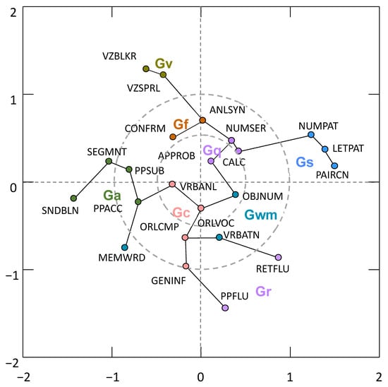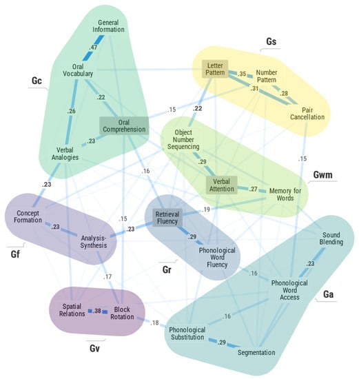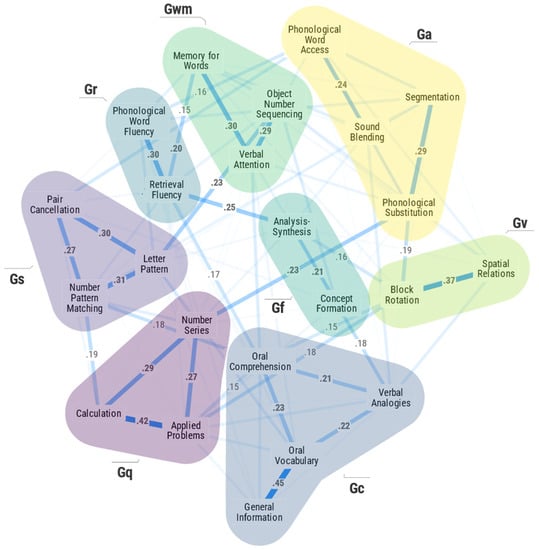 The final set of 20 broad CHC measures used in the primary analysis, as classified by (), (), and our own CHC analysis, were: Fluid Reasoning-Gf (Concept Formation, CONFRM; Analysis-Synthesis, ANLSYN), Comprehension–Knowledge-Gc (Oral Vocabulary, ORLVOC, General Information, GENINF; Oral Comprehension, ORLCMP; Verbal Analogies, VRBANL), Visual Processing-Gv (Spatial Relations, VZSPRL; Block Rotation, VZBLKR), Auditory Processing-Ga (Segmentation, SEGMNT; Sound Blending, SNDBLN; Phonological Processing-Word Access, PPACC; Phonological Processing-Word Substitution, PPSUB), Short-term Working Memory-Gwm (Verbal Attention, VRBATN; Objective-Number Sequencing, OBJNUM; Memory for Words, MEMWRD), Retrieval Fluency-Gr (Retrieval Fluency, RETFLU; Phonological Processing–Word Fluency, PPLU), Processing Speed-Gs (Letter–Pattern Matching, LETPAT; Number Pattern Matching, NUMPAT; Pair Cancellation; PAIRCN). It is important to note that this set of WJ IV measures differs from the () PNA study that was restricted to the primary 14 COG measures in the WJ IV. The current study selected the purest CHC measures from across the WJ IV COG, OL, and ECAD components.
