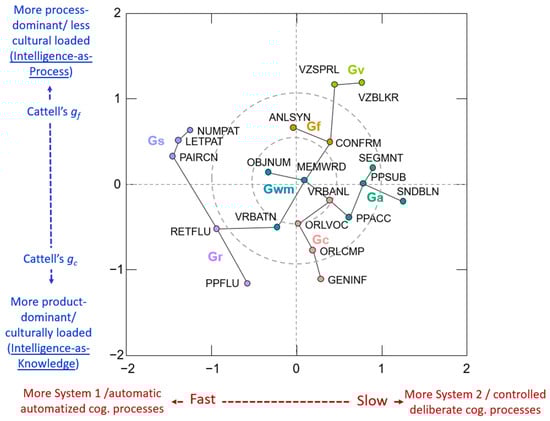 An underlying System 1-System II cognitive processing dimension of broad CHC-categorized abilities is suggested by the PNA complimentary MDS + MST analysis (see Figure 3). The X-axis finds the left-half populated by Gs tests (Letter–Patten Matching, Number Pattern Matching, Pair Cancellation) and Gr tests (Retrieval Fluency, Phonological Processing–Word Fluency), measures sharing a speed-fluency requirement. The next most adjacent tests are Verbal Attention and Object–Number Sequencing, both measures of working memory (Gwm) requiring significant attentional control. Collectively the X-axis appears anchored on the far left by tests of broad CHC abilities representing parameters of cognitive processing efficiency, particularly the ability to control attention under time constraints (, ). The tests towards the right half of the X-axis are non-speeded or level measures () that require more controlled or deliberate cognitive processes. This cognitive processing distinction is based on an extensive history of dual-mode cognitive processing research in cognitive psychology (; ; ) and was previously suggested, in the context of CHC theory, by ().