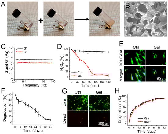 (A) The images of the gelation process. (B) The SEM observation of hydrogel. (C) Frequency spectra of G′ and G″ moduli of the hydrogel. (D) Decomposition of H2O2 (1.0 M) with and without hydrogel. (E) The evaluation of ROS scavenging by DCFH-DA staining. (F) The in vitro degradation of hydrogel. (G) Calcein AM/PI staining of cells. (H) Release profiles of vancomycin and BMP-2 from the hydrogel.