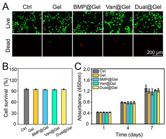 The biocompatibility of BMSCs in drug-loaded hydrogels was investigated using Calcein-AM/PI staining detection and a CCK-8 assay. The results indicated that BMSCs in all groups displayed green fluorescence, suggesting that almost all living cells were stained with the Calcein AM dye (Figure 2A). Quantitative analysis showed that the cell survival rates in the control, Gel, BMP@Gel, Van@Gel, and Dual@Gel groups were 94.6% ± 2.4%, 93.9% ± 1.6%, 93.2% ± 1.4%, 93.2% ± 1.5%, and 93.8% ± 1.5%, respectively (Figure 2B). As exhibited in Figure 2C, BMSCs co-cultured in the different groups proliferated gradually without a significant difference at days 1, 4, and 7, showing that the vancomycin or BMP-2-loaded hydrogel had good biocompatibility.